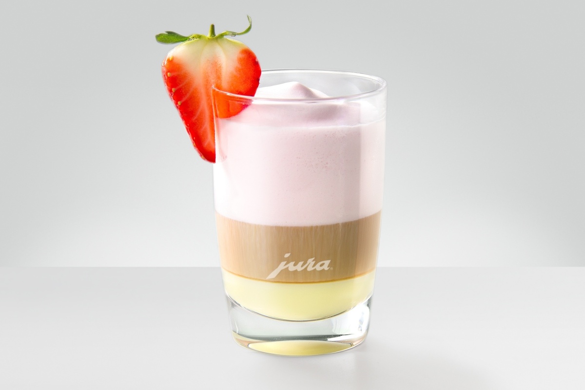 Doe de melk en de aardbeiensiroop in de melkopschuimer en bereid een portie warm melkschuim.
