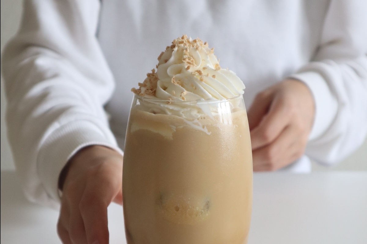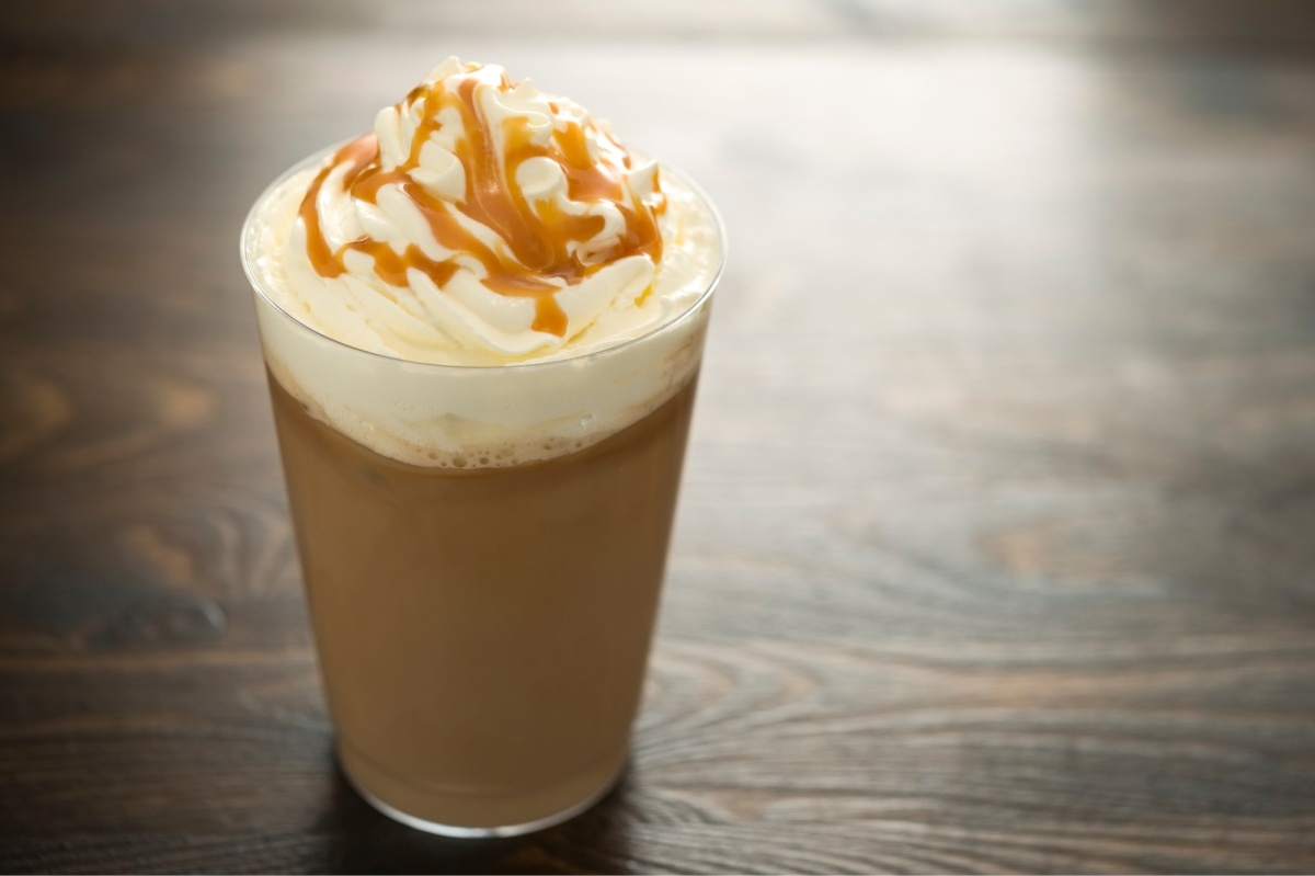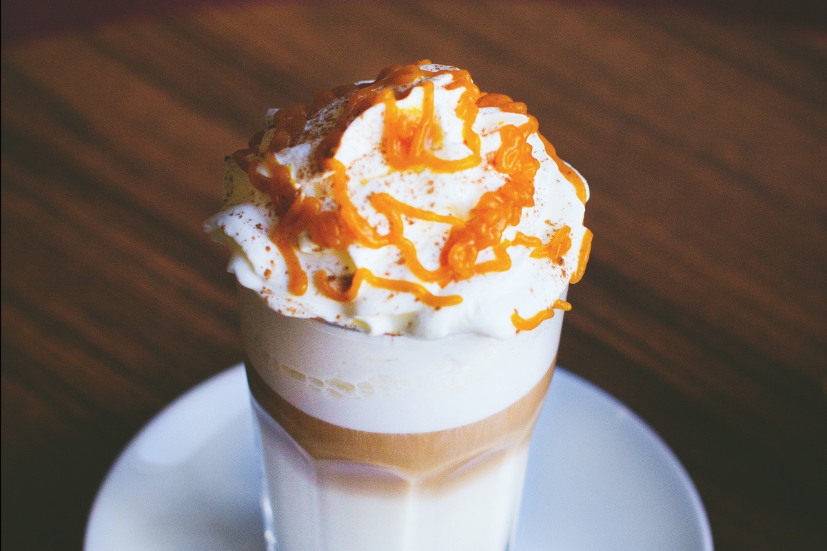 Nadat je de melk hebt toegevoegd doe er en grote toef slagroom boven op met wat karamel saus.